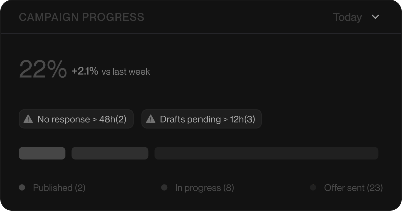 When momentum hits, manual outreach fails. Pulse activates personalized, multi-channel outreach to hundreds of creators at once. You approve. The agent executes.